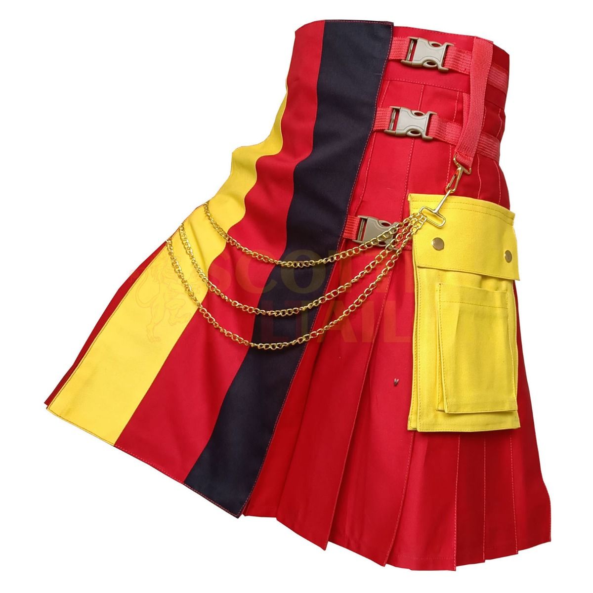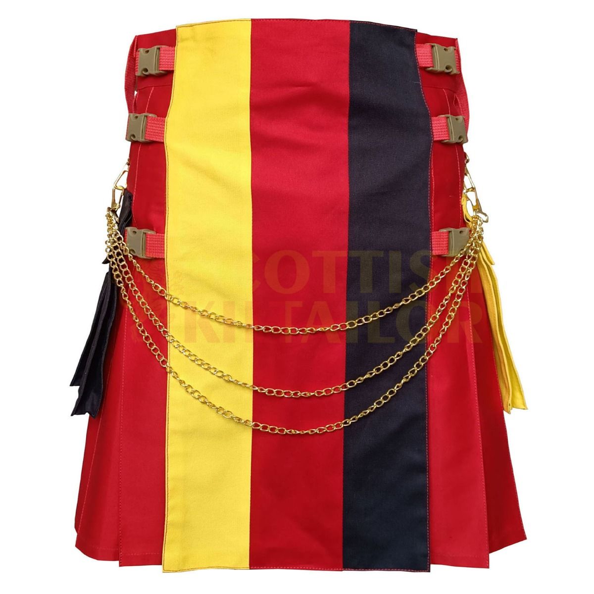 German Flag Kilt 100% Cotton Full Handmade No Printing with removable front panel.  is made of 100% cotton in three colors Black, Red, and Gold with high-quality panels. This German Flag Kilt has Red nylon straps with buckles. This German Flag Kilt has a perfect combination of modern and classic design. You can wear this kilt on Freedom Day, at National events, and at other events/parties.