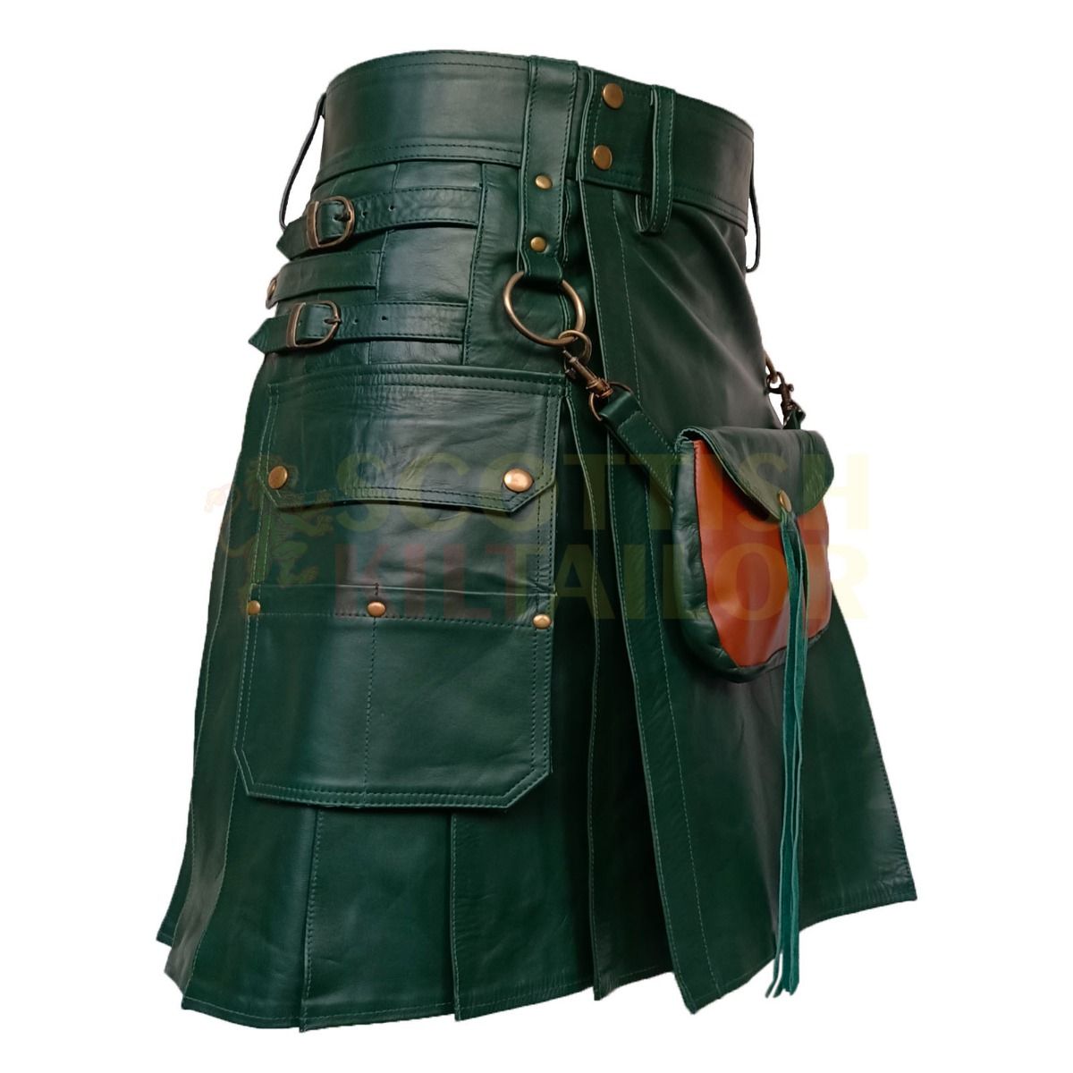 Green Leather Utility kilt With Side Cargo Pocket And Front Sporran